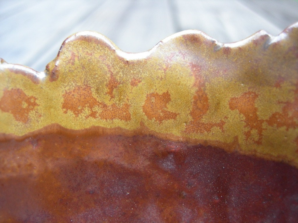ON SALE to make room for more inventory: The petaled edges of this noborigama wood fired bowl were glazed in yellow. 4"x4", this bowl is heavily naturally textured on the outside with a smooth reddish glaze finish inside. Food, dishwasher and microwave safe.