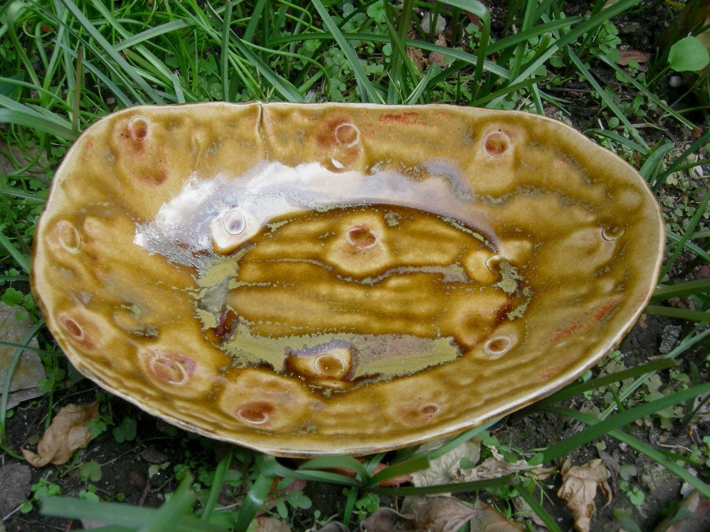 This asymmetrical stoneware serving dish has multiple layers of glaze, highlighting dots of clay in a different color. It's light weight, delicate but sturdy, and pefect for dips or a side dish at dinner. Microwave, oven and dishwasher safe.